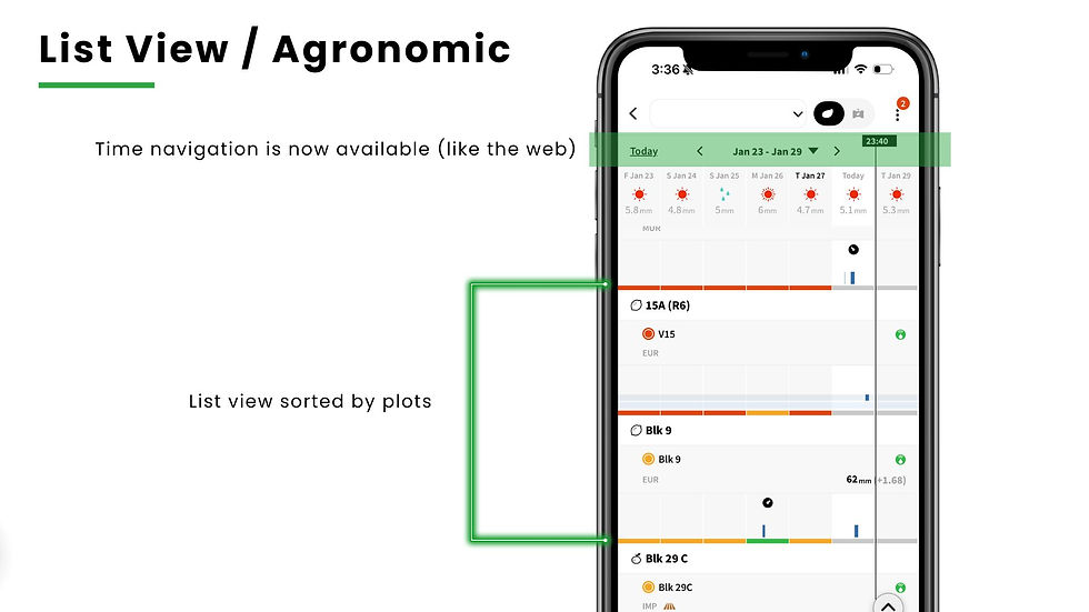 Agronomic vs. Hydraulic modes: A new toggle on the top bar allows users to switch between Hydraulic and Agronomic modes. This affects the three main pages (Map, List, and Plot), shifting the features and perspective accordingly.